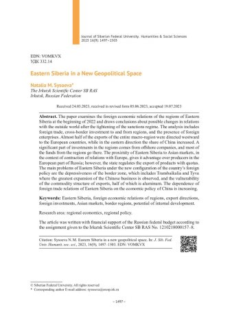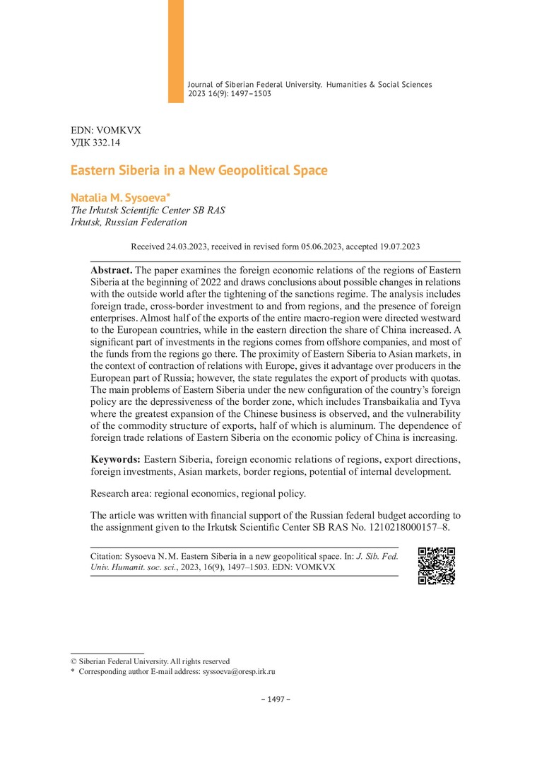Библиографическое описание:Сысоева, Н. М. Восточная Сибирь в новом геополитическом пространстве = Eastern Siberia in a New Geopolitical Space / Н. М. Сысоева. - Текст : непосредственный // Журнал Сибирского федерального университета. Гуманитарные науки. - 2023. - Т. 16, № 9. - С. 1497-1503. - Библиогр.: с. 1503. - ISSN 1997-1370.