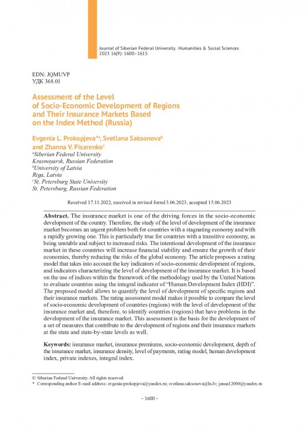 Библиографическое описание:Prokopjeva, Evgenia. Assessment of the Level of Socio-Economic Development of Regions and Their Insurance Markets Based on the Index Method (Russia) = Оценка уровня социально-экономического развития регионов и их страховых рынков на основе индексного метода (на примере России) / E. L. Prokopjeva, Svetlana Saksonova, Z. V. Pisarenko. - Текст : непосредственный // Журнал Сибирского федерального университета. Гуманитарные науки. - 2023. - Т. 16, № 9. - С. 1600-1615. - Библиогр.: с. 1614-1615. - ISSN 1997-1370.