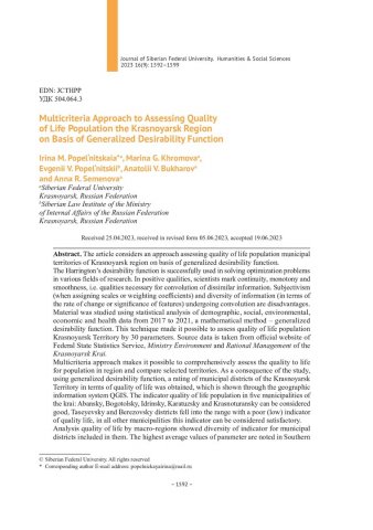 Библиографическое описание:Многокритериальный подход к оценке качества жизни населения территорий Красноярского края на основе обобщённой функции желательности = Multicriteria Approach to Assessing Quality of Life Population the Krasnoyarsk Region on Basis of Generalized Desirability Function / И. М. Попельницкая, М. Г. Хромова, Е. В. Попельницкий [и др.]. - Текст : непосредственный // Журнал Сибирского федерального университета. Гуманитарные науки. - 2023. - Т. 16, № 9. - С. 1592-1599. - Библиогр.: с. 1599. - ISSN 1997-1370.