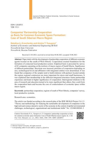 Библиографическое описание:Кравченко, Н. А. Партнерские взаимодействия предприятий как основа формирования единого экономического пространства (на примере Южно-Сибирского макрорегиона) = Companies` Partnership Cooperation as Basis for Common Economic Space Formation: Case of South Siberian Macro Region / Н. А. Кравченко, А. Т. Юсупова. - Текст : непосредственный // Журнал Сибирского федерального университета. Гуманитарные науки. - 2023. - Т. 16, № 9. - С. 1584-1591. - Библиогр.: с. 1590-1591 . - ISSN 1997-1370.