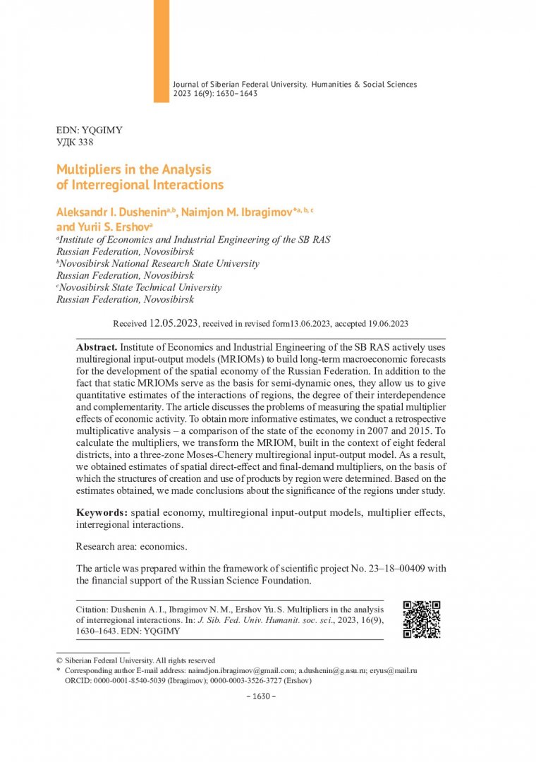 Библиографическое описание:Dushenin, Аleksandr. Multipliers in the Analysis of Interregional Interactions = Мультипликаторы в анализе межрегиональных взаимодействий / А. I. Dushenin, N. M. Ibragimov, Y. S. Ershov. - Текст : непосредственный // Журнал Сибирского федерального университета. Гуманитарные науки. - 2023. - Т. 16, № 9. - С. 1630-1643. - Библиогр.: с. 1640-1641. - ISSN 1997-1370.