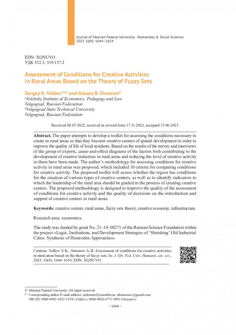 Библиографическое описание:Волков, С. К. Оценка условий для ведения креативной деятельности в сельских территориях на основе теории нечетких множеств = Assessment of Conditions for Creative Activities in Rural Areas Based on the Theory of Fuzzy Sets / С. К. Волков, А. Б. Симонов. - Текст : непосредственный // Журнал Сибирского федерального университета. Гуманитарные науки. - 2023. - Т. 16, № 9. - С. 1644-1654. - Библиогр.: с. 1653-1654. - ISSN 1997-1370.