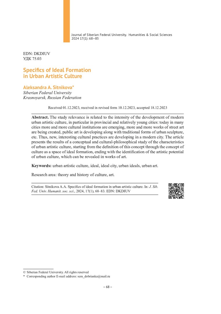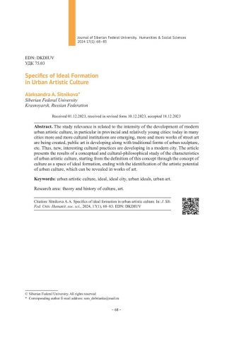 Библиографическое описание:Ситникова, А. А. Специфика идеалообразования в городской художественной культуре = Specifics of Ideal Formation in Urban Artistic Culture / А. А. Ситникова. - Текст : непосредственный // Журнал Сибирского федерального университета. Гуманитарные науки. - 2024. - Т. 17, № 1. - С. 68-83. - Библиогр.: с. 82-83. - ISSN 1997-1370.