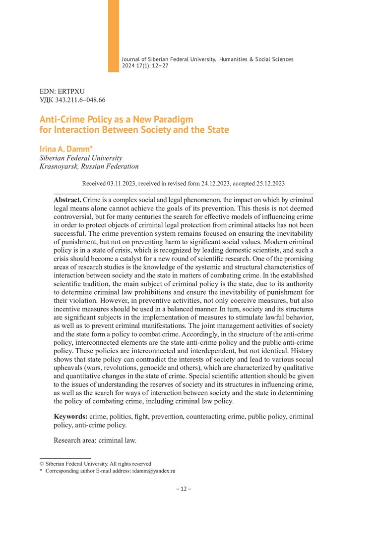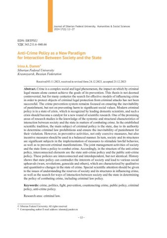 Библиографическое описание:Дамм, И. А. Политика противодействия преступности как новая парадигма взаимодействия общества и государства = Anti-Crime Policy as a New Paradigm for Interaction Between Society and the State / И. А. Дамм. - Текст : непосредственный // Журнал Сибирского федерального университета. Гуманитарные науки. - 2024. - Т. 17, № 1. - С. 12-27. - Библиогр.: с. 25-27. - ISSN 1997-1370.