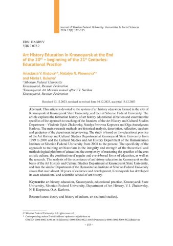 Библиографическое описание:Кистова, А. В. Искусствоведческое образование в Красноярске в конце XX – начале XXI вв.: образовательная практика = Art History Education in Krasnoyarsk at the End of the 20th – beginning of the 21st Centuries: Educational Practice / А. В. Кистова, Н. Н. Пименова, М. И. Букова. - Текст : непосредственный // Журнал Сибирского федерального университета. Гуманитарные науки. - 2024. - Т. 17, № 1. - С. 137-153. - Библиогр.: с. 148-153. - ISSN 1997-1370.