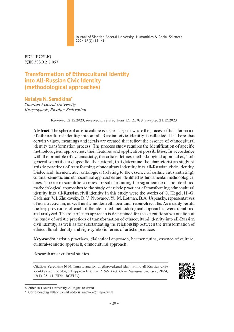 Библиографическое описание:Середкина, Н. Н. Трансформация этнокультурной идентичности в общероссийскую гражданскую идентичность (методологические подходы) = Transformation of Ethnocultural Identity into All- Russian Civic Identity (methodological approaches) / Н. Н. Середкина. - Текст : непосредственный // Журнал Сибирского федерального университета. Гуманитарные науки. - 2024. - Т. 17, № 1. - С. 28-41. - Библиогр.: с. 37-41. - ISSN 1997-1370.