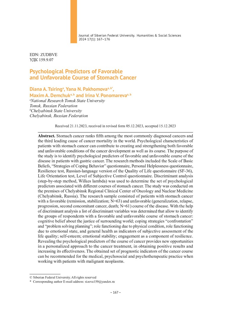 Библиографическое описание:Психологические предикторы благоприятного и неблагоприятного течения рака желудка = Psychological Predictors of Favorable and Unfavorable Course of Stomach Cancer / Д. А. Циринг, Я. Н. Пахомова, М. А. Демчук, И. В. Пономарева. - Текст : непосредственный // Журнал Сибирского федерального университета. Гуманитарные науки. - 2024. - Т. 17, № 1. - С. 167-176. - Библиогр.: с. 175-176. - ISSN 1997-1370.