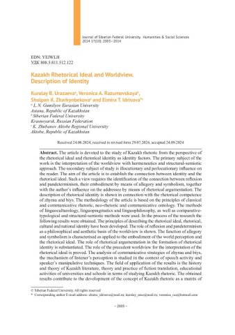 Библиографическое описание:Kazakh Rhetorical Ideal and Worldview. Description of Identity = Казахский риторический идеал и картина мира. Описание идентичности / K. B. Urazaeva, V. A. Razumovskaya, S. K. Zharkynbekova, E. T. Idrisova. - Текст : непосредственный // Журнал Сибирского федерального университета. Гуманитарные науки. - 2024. - Т. 17, № 10. - С. 2003-2014. - Библиогр.: с. 2013-2014. - ISSN 1997-1370.