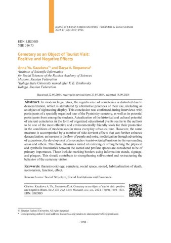 Библиографическое описание:Казакова, А. Ю. Кладбище как объект туристического посещения: позитивные и негативные эффекты = Cemetery as an Object of Tourist Visit: Positive and Negative Effects / А. Ю. Казакова, Д. А. Степанова. - Текст : непосредственный // Журнал Сибирского федерального университета. Гуманитарные науки. - 2024. - Т. 17, № 10. - С. 1910-1921. - Библиогр.: с. 1920-1921. - ISSN 1997-1370.