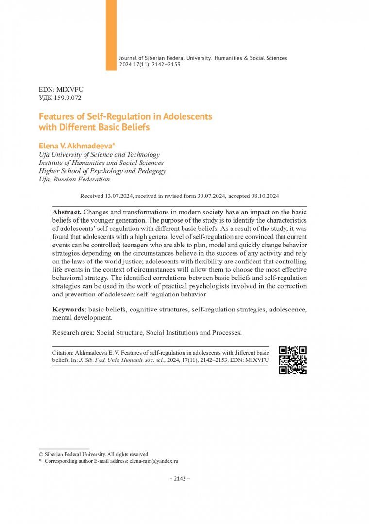 Библиографическое описание:Ахмадеева, Е. В. Особенности саморегуляции подростков с разными базисными убеждениями = Features of Self-Regulation in Adolescents with Different Basic Beliefs / Е. В. Ахмадеева. - Текст : непосредственный // Журнал Сибирского федерального университета. Гуманитарные науки. - 2024. - Т. 17, № 11. - С. 2142-2153. - Библиогр.: с. 2152-2153. - ISSN 1997-1370.