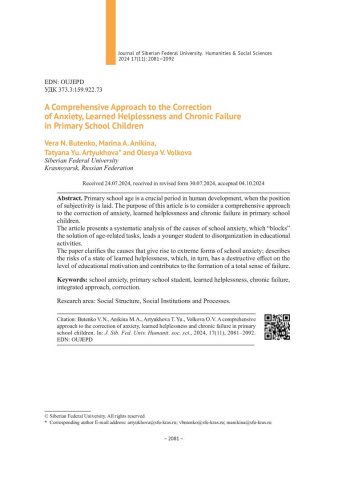 Библиографическое описание:Комплексный подход к коррекции тревожности, выученной беспомощности и хронической неуспешности у младших школьников = A Comprehensive Approach to the Correction of Anxiety, Learned Helplessness and Chronic Failure in Primary School Children / В. Н. Бутенко, М. А. Аникина, Т. Ю. Артюхова, О. В. Волкова. - Текст : непосредственный // Журнал Сибирского федерального университета. Гуманитарные науки. - 2024. - Т. 17, № 11. - С. 2081-2092. - Библиогр.: с. 2091-2092. - ISSN 1997-1370.