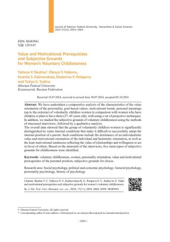 Библиографическое описание:Value and Motivational Prerequisites and Subjective Grounds for Women’s Voluntary Childlessness = Ценностные и мотивационные предпосылки и субъективные основания добровольного выбора женщинами бездетности / T. V. Skutina, O. V. Volkova, K. S. Kalinovskaia [et al.]. - Текст : непосредственный // Журнал Сибирского федерального университета. Гуманитарные науки. - 2024. - Т. 17, № 11. - С. 2054-2064. - Библиогр.: с. 2063-2064. - ISSN 1997-1370.