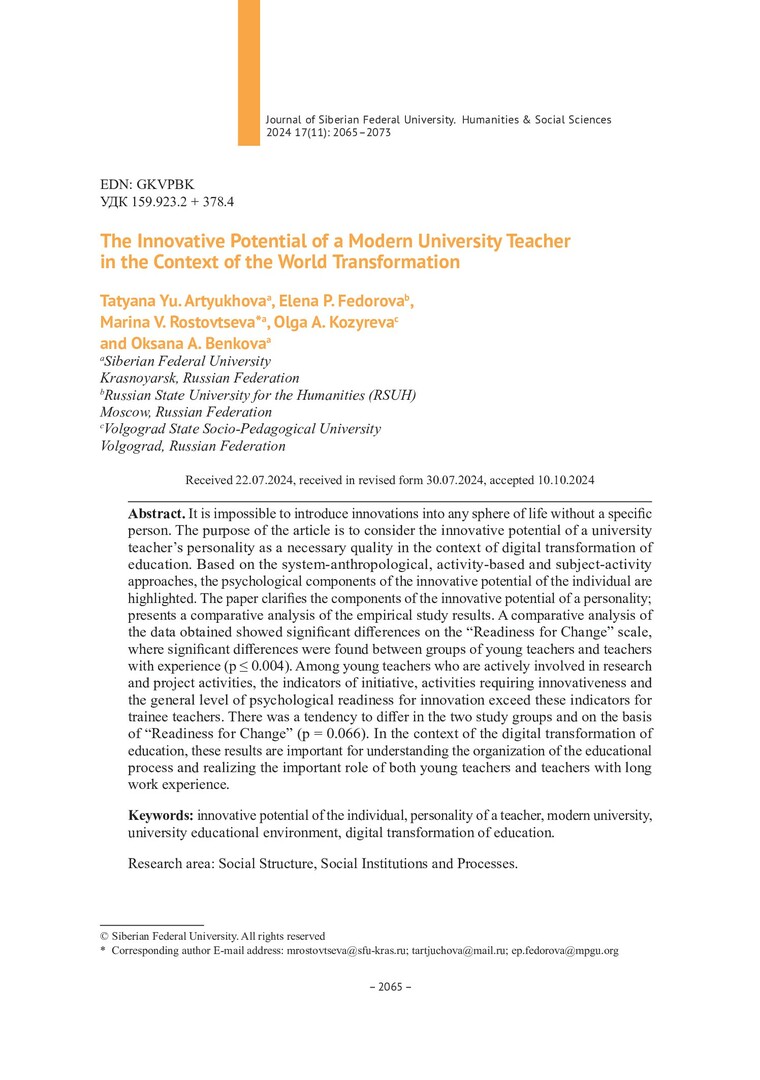Библиографическое описание:Инновационный потенциал преподавателя современного университета в условиях цифровой трансформации образования = The Innovative Potential of a Modern University Teacher in the Context of the World Transformation / Т. Ю. Артюхова, Е. П. Федорова, М. В. Ростовцева [и др.]. - Текст : непосредственный // Журнал Сибирского федерального университета. Гуманитарные науки. - 2024. - Т. 17, № 11. - С. 2065-2073. - Библиогр.: с. 2072-2073. - ISSN 1997-1370.
