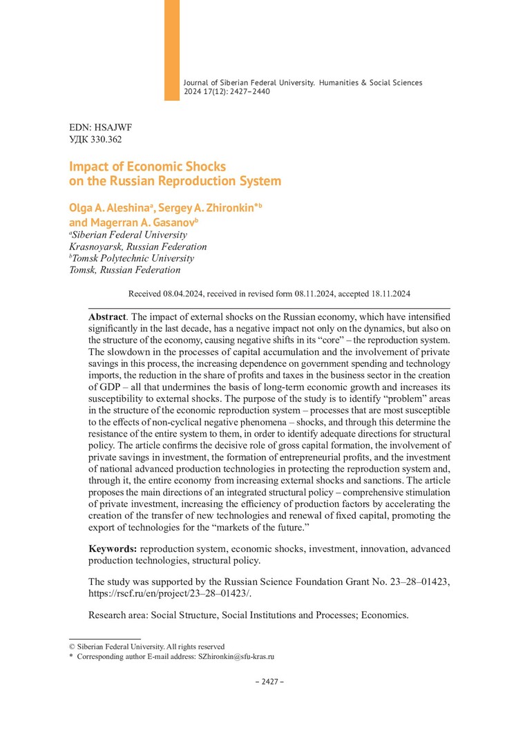 Библиографическое описание:Aleshina, Olga. Impact of Economic Shocks on the Russian Reproduction System = Воздействие экономических шоков на российскую воспроизводственную систему / O. A. Aleshina, S. A. Zhironkin, M. A. Gasanov. - Текст : непосредственный // Журнал Сибирского федерального университета. Гуманитарные науки. - 2024. - Т. 17, № 12. - С. 2427-2440. - Библиогр.: с. 2439-2440. - ISSN 1997-1370.