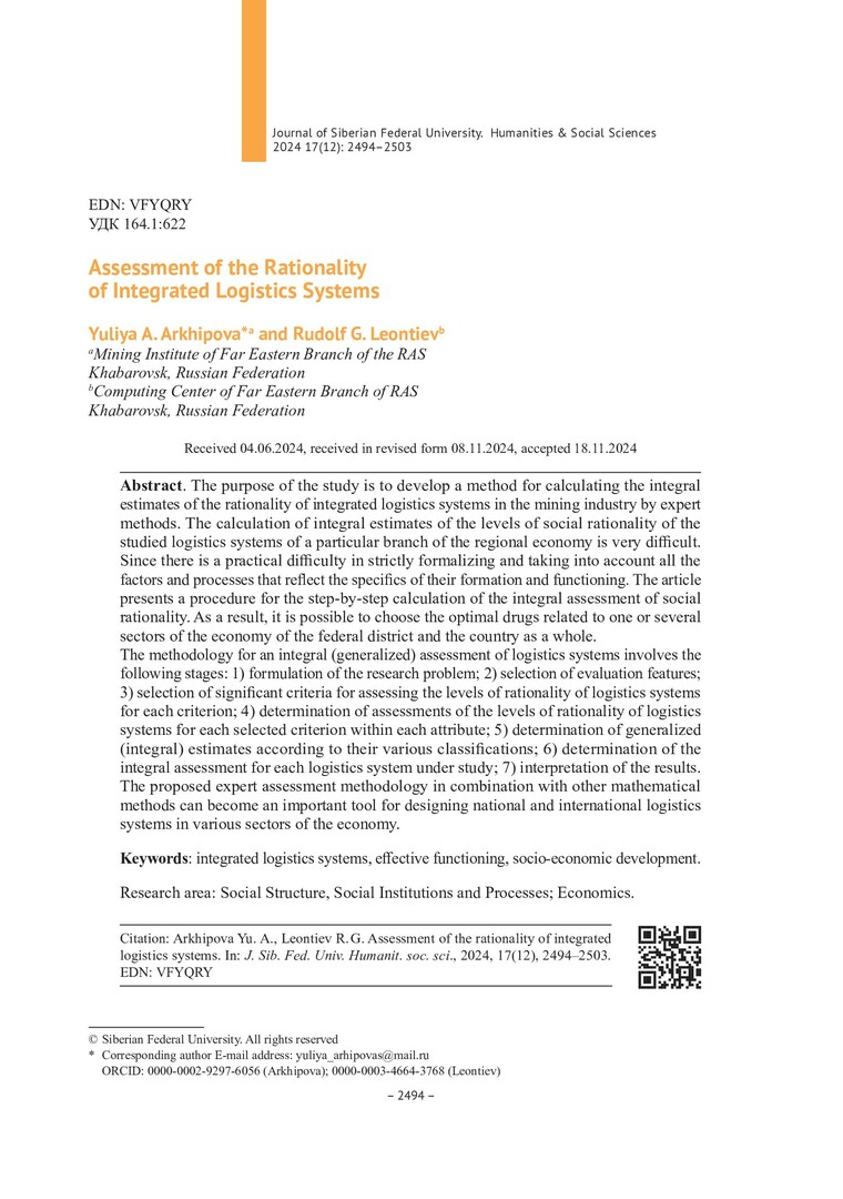 Библиографическое описание:Arkhipova, Yuliya. Assessment of the Rationality of Integrated Logistics Systems = Оценка рациональности интегрированных логистических систем / Y. A. Arkhipova, R. G. Leontiev. - Текст : непосредственный // Журнал Сибирского федерального университета. Гуманитарные науки. - 2024. - Т. 17, № 12. - С. 2494-2503. - Библиогр.: с. 2503. - ISSN 1997-1370.