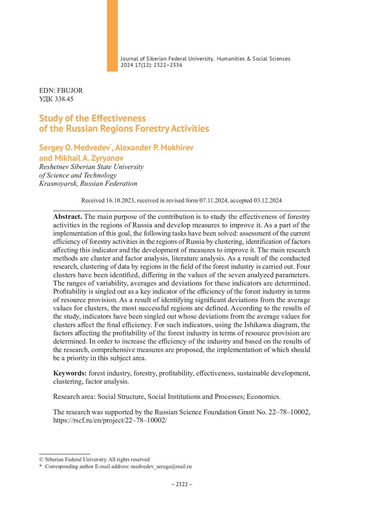 Библиографическое описание:Medvedev, Sergey. Study of the Effectiveness of the Russian Regions Forestry Activities = Исследование эффективности лесохозяйственной деятельности регионов России / S. O. Medvedev, A. P. Mokhirev, M. A. Zyryanov. - Текст : непосредственный // Журнал Сибирского федерального университета. Гуманитарные науки. - 2024. - Т. 17, № 12. - С. 2322-2336. - Библиогр.: с. 2335-2336. - ISSN 1997-1370.