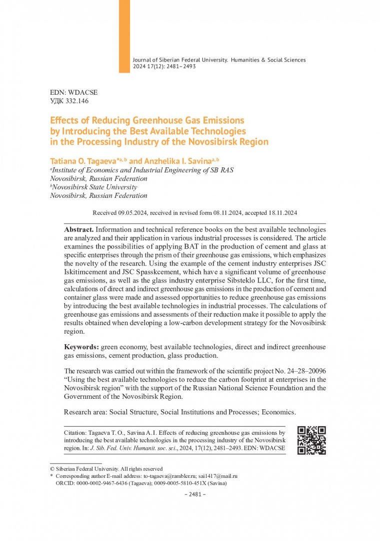 Библиографическое описание:Тагаева, Т. О. Эффекты сокращения выбросов парниковых газов при внедрении наилучших доступных технологий в обрабатывающей промышленности Новосибирской области = Effects of Reducing Greenhouse Gas Emissions by Introducing the Best Available Technologies in the Processing Industry of the Novosibirsk Region / Т. О. Тагаева, А. И. Савина. - Текст : непосредственный // Журнал Сибирского федерального университета. Гуманитарные науки. - 2024. - Т. 17, № 12. - С. 2481-2493. - Библиогр.: с. 2492-2493. - ISSN 1997-1370.