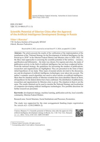 Библиографическое описание:Блануца, В. И. Научный потенциал сибирских городов после утверждения стратегии развития искусственного интеллекта в России = Scientific Potential of Siberian Cities after the Approval of the Artificial Intelligence Development Strategy in Russia / В. И. Блануца. - Текст : непосредственный // Журнал Сибирского федерального университета. Гуманитарные науки. - 2024. - Т. 17, № 12. - С. 2310-2321. - Библиогр.: с. 2320-2321. - ISSN 1997-1370.