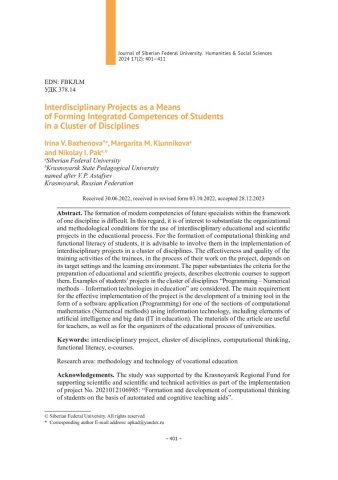 Библиографическое описание:Баженова, И. В. Междисциплинарные проекты как средство формирования комплексных компетенций студентов в кластере дисциплин = Interdisciplinary Projects as a Means of Forming Integrated Competences of Students in a Cluster of Disciplines / И. В. Баженова, М. М. Клунникова, Н. И. Пак. - Текст : непосредственный // Журнал Сибирского федерального университета. Гуманитарные науки. - 2024. - Т. 17, № 2. - С. 401-411. - Библиогр.: с. 410-411. - ISSN 1997-1370.