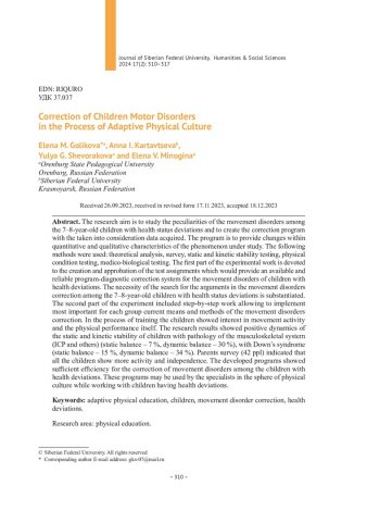 Библиографическое описание:Коррекция двигательных нарушений детей в процессе адаптивной физической культуры = Correction of Children Motor Disorders in the Process of Adaptive Physical Culture / Е. М. Голикова, А. И. Картавцева, Ю. Г. Шеворакова, Е. В. Миногина. - Текст : непосредственный // Журнал Сибирского федерального университета. Гуманитарные науки. - 2024. - Т. 17, № 2. - С. 310-317. - Библиогр.: с. 316-317. - ISSN 1997-1370.