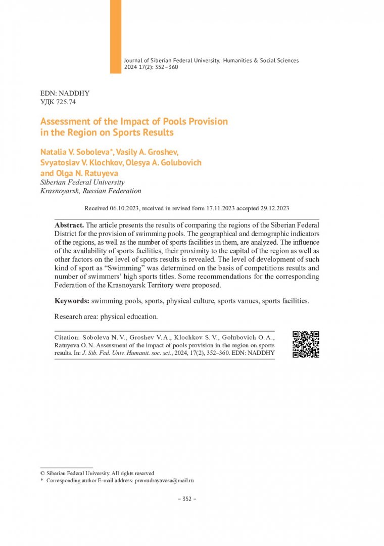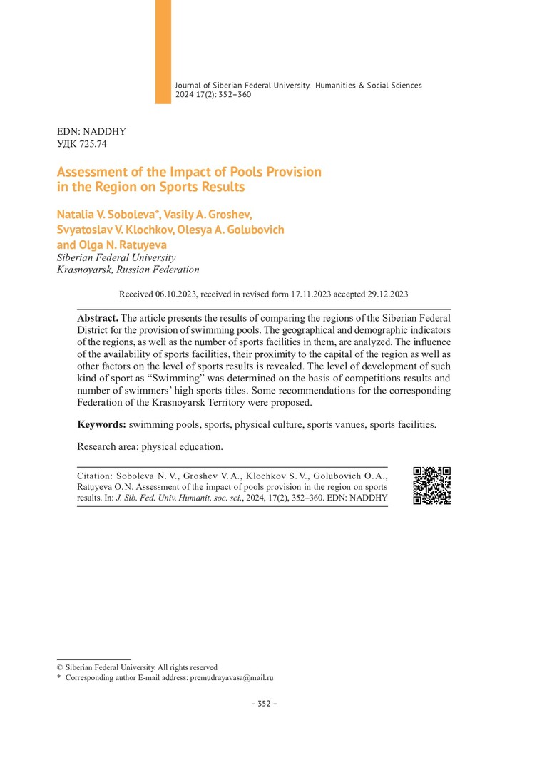 Библиографическое описание:Оценка влияния обеспеченности региона плавательными бассейнами на спортивные результаты = Assessment of the Impact of Pools Provision in the Region on Sports Results / Н. В. Соболева, В. А. Грошев, С. В. Клочков [и др.]. - Текст : непосредственный // Журнал Сибирского федерального университета. Гуманитарные науки. - 2024. - Т. 17, № 2. - С. 352-360. - Библиогр.: с. 359-360. - ISSN 1997-1370.