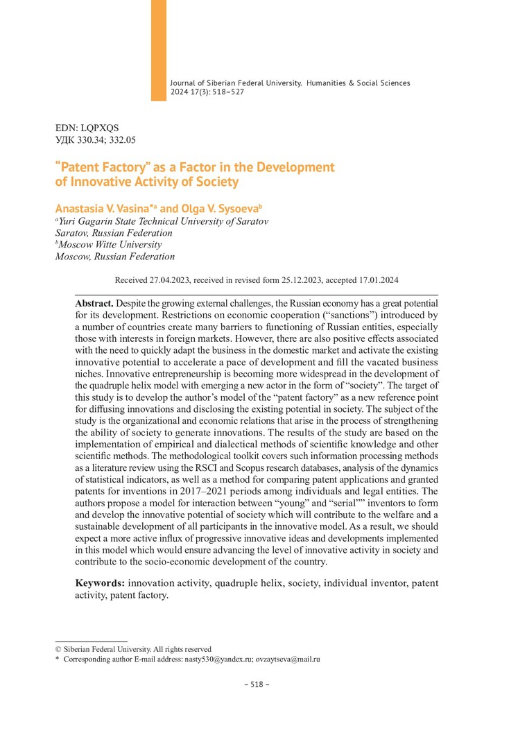 Библиографическое описание:Vasina, Anastasia. “Patent Factory” as a Factor in the Development of Innovative Activity of Society = "Фабрика патентов" как фактор развития инновационной активности в обществе / A. V. Vasina, O. V. Sysoeva. - Текст : непосредственный // Журнал Сибирского федерального университета. Гуманитарные науки. - 2024. - Т. 17, № 3. - С. 518-527. - Библиогр.: с. 526-527. - ISSN 1997-1370.
