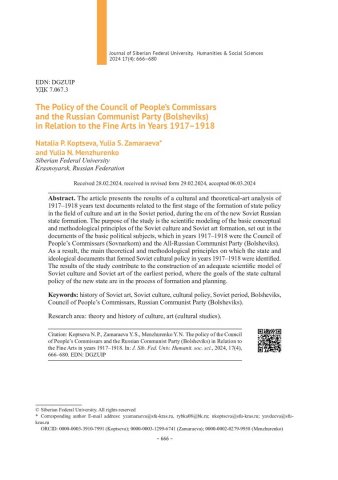 Библиографическое описание:Копцева, Н. П. Политика Совнаркома и Российской коммунистической партии (большевиков) по отношению к изобразительному искусству в 1917–1918 гг. = The Policy of the Council of Peoples Commissars and the Russian Communist Party (Bolsheviks) in Relation to the Fine Arts in Years 1917–1918 / Н. П. Копцева, Ю. С. Замараева, Ю. Н Менжуренко. - Текст : непосредственный // Журнал Сибирского федерального университета. Гуманитарные науки. - 2024. - Т. 17, № 4. - С. 666-680. - Библиогр.: с. 677-680. - ISSN 1997-1370.