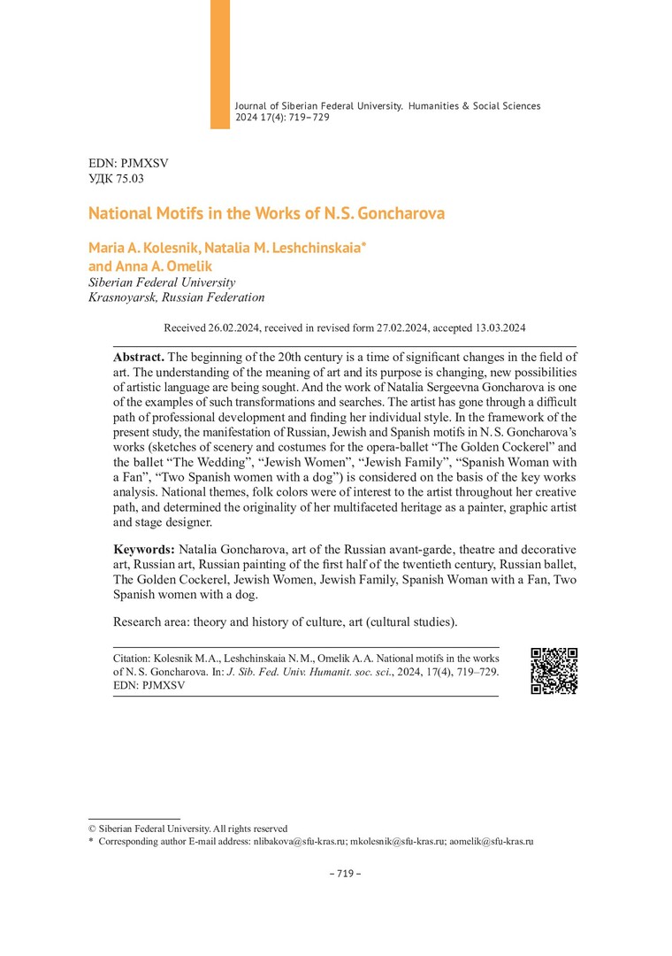 Библиографическое описание:Колесник, М. А. Национальные мотивы в творчестве Н. С. Гончаровой = National Motifs in the Works of N. S. Goncharova / М. А. Колесник, Н. М. Лещинская, А. А. Омелик. - Текст : непосредственный // Журнал Сибирского федерального университета. Гуманитарные науки. - 2024. - Т. 17, № 4. - С. 719-729. - Библиогр.: с. 727-729. - ISSN 1997-1370.
