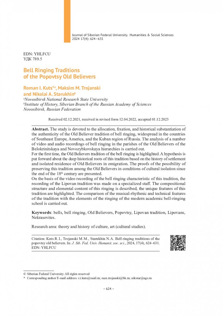Библиографическое описание:Куц, Р. И. Традиции колокольного звона староверов поповских согласий = Bell Ringing Traditions of the Popovtsy Old Believers / Р. И. Куц, М. М. Троянский, Н. А. Старухин. - Текст : непосредственный // Журнал Сибирского федерального университета. Гуманитарные науки. - 2024. - Т. 17, № 4. - С. 624-631. - Библиогр.: с. 630-631. - ISSN 1997-1370.
