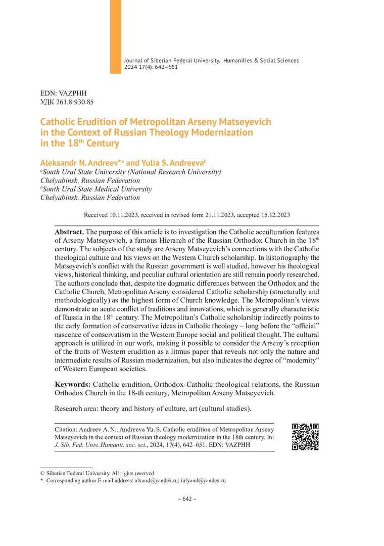 Библиографическое описание:Andreev, Aleksandr. Catholic Erudition of Metropolitan Arseny Matseyevich in the Context of Russian Theology Modernization in the 18th Century = Католическая ученость митрополита Арсения Мацеевича в контексте модернизации русского богословия XVIII века / A. N. Andreev, Y. S. Andreeva. - Текст : непосредственный // Журнал Сибирского федерального университета. Гуманитарные науки. - 2024. - Т. 17, № 4. - С. 642-651. - Библиогр.: с. 650-651. - ISSN 1997-1370.