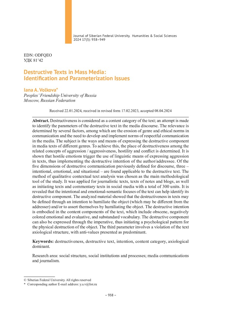 Библиографическое описание:Волкова, Я. А. Деструктивные тексты в массмедиа: проблемы выделения и параметризации = Destructive Texts in Mass Media: Identification and Parameterization Issues / Я. А. Волкова. - Текст : непосредственный // Журнал Сибирского федерального университета. Гуманитарные науки. - 2024. - Т. 17, № 5. - С. 938-949. - Библиогр.: с. 947-949. - ISSN 1997-1370.