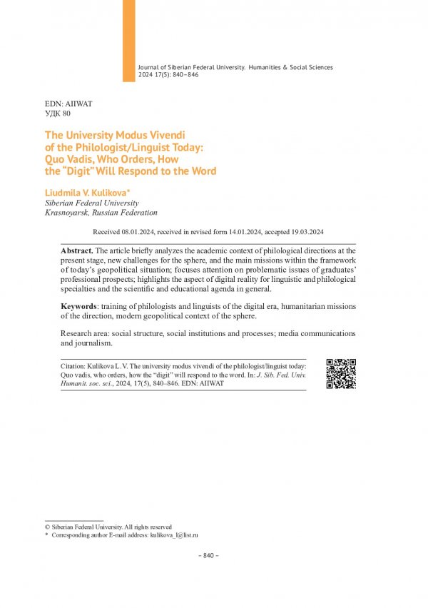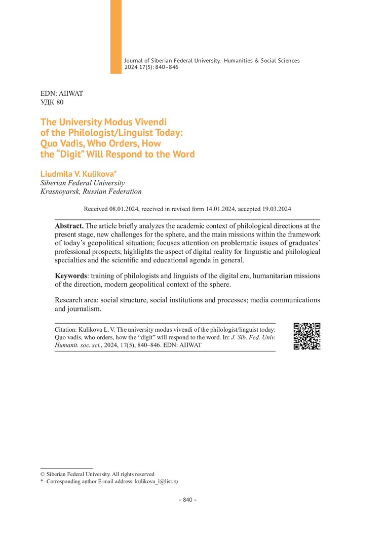 Библиографическое описание:Куликова, Л. В. Университетский Modus Vivendi филолога / лингвиста сегодня: Quo Vadis, кто заказывает, как "Цифра" Слову отзовется = The University Modus Vivendi of the Philologist/Linguist Today: Quo Vadis, Who Orders, How the "Digit" Will Respond to the Word / Л. В. Куликова. - Текст : непосредственный // Журнал Сибирского федерального университета. Гуманитарные науки. - 2024. - Т. 17, № 5. - С. 840-846. - Библиогр.: с. 846. - ISSN 1997-1370.
