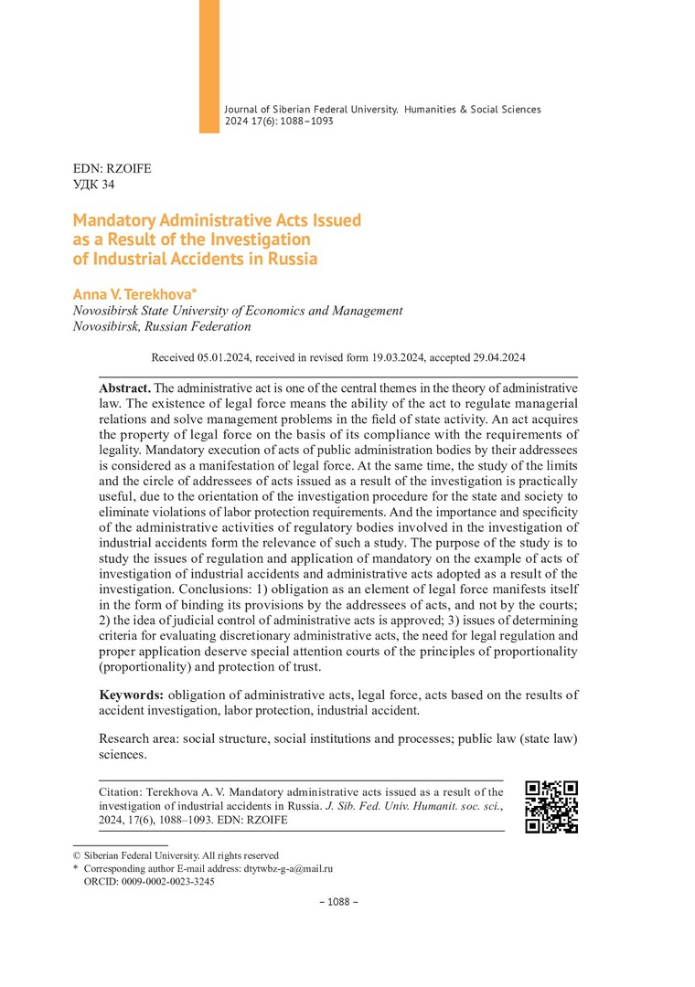 Библиографическое описание:Terekhova, Anna. Mandatory Administrative Acts Issued as a Result of the Investigation of Industrial Accidents in Russia = Обязательность административных актов, изданных по результатам расследования несчастных случаев на производстве / A. V. Terekhova. - Текст : непосредственный // Журнал Сибирского федерального университета. Гуманитарные науки. - 2024. - Т. 17, № 6. - С. 1088-1093. - Библиогр.: с. 1093. - ISSN 1997-1370.