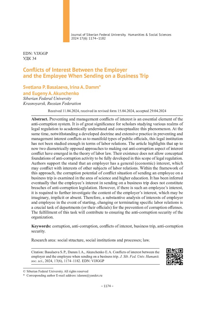 Библиографическое описание:Басалаева, С. П. Конфликт интересов работодателя и работника при направлении в служебную командировку = Conflicts of Interest Between the Employer and the Employee When Sending on a Business Trip / С. П. Басалаева, И. А. Дамм, Е. А. Акунченко. - Текст : непосредственный // Журнал Сибирского федерального университета. Гуманитарные науки. - 2024. - Т. 17, № 6. - С. 1174-1182. - Библиогр.: с. 181-1182. - ISSN 1997-1370.