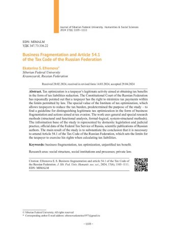 Библиографическое описание:Ефремова, Е. С. Дробление бизнеса и статья 54.1 Налогового кодекса Российской Федерации = Business Fragmentation and Article 54.1 of the Tax Code of the Russian Federation / Е. С. Ефремова. - Текст : непосредственный // Журнал Сибирского федерального университета. Гуманитарные науки. - 2024. - Т. 17, № 6. - С. 1103-1111. - Библиогр.: с. 1111. - ISSN 1997-1370.