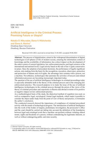 Библиографическое описание:Никурадзе, Н. О. Искусственный интеллект в уголовном процессе: перспективное будущее или утопия? = Artificial Intelligence in the Criminal Process: Promising Future or Utopia? / Н. О. Никурадзе, Е. В. Мищенко, Е. А. Марина. - Текст : непосредственный // Журнал Сибирского федерального университета. Гуманитарные науки. - 2024. - Т. 17, № 6. - С. 1134-1143. - Библиогр.: с. 1143. - ISSN 1997-1370.