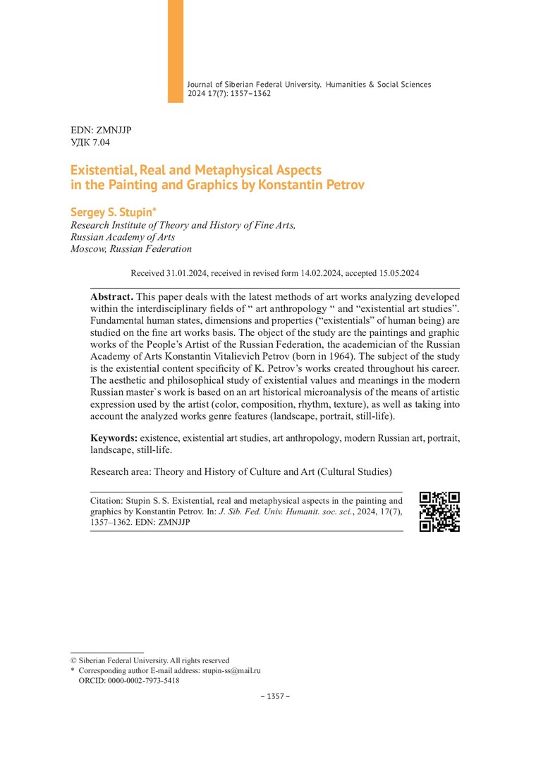 Библиографическое описание:Ступин, С. С. Экзистенциальное, реальное, метафизическое в живописи и графике Константина Петрова = Existential, Real and Metaphysical Aspects in the Painting and Graphics by Konstantin Petrov / С. С. Ступин. - Текст : непосредственный // Журнал Сибирского федерального университета. Гуманитарные науки. - 2024. - Т. 17, № 7. - С. 1357-1362. - Библиогр.: с. 1362. - ISSN 1997-1370.