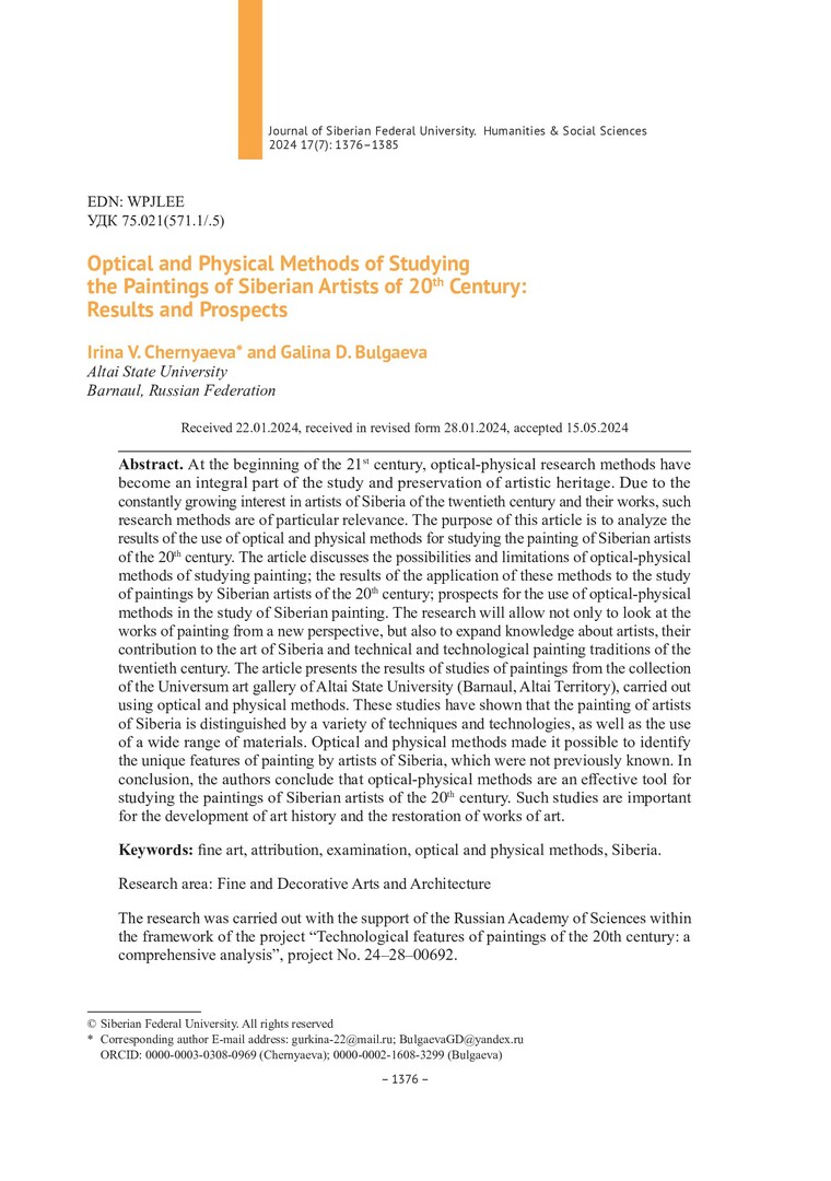 Библиографическое описание:Черняева, И. В. Оптико-физические методы исследования живописи художников Сибири ХX в.: результаты и перспективы = Optical and Physical Methods of Studying the Paintings of Siberian Artists of 20th Century: Results and Prospects / И. В. Черняева, Г. Д. Булгаева. - Текст : непосредственный // Журнал Сибирского федерального университета. Гуманитарные науки. - 2024. - Т. 17, № 7. - С. 1376-1385. - Библиогр.: с. 1384-1385. - ISSN 1997-1370.