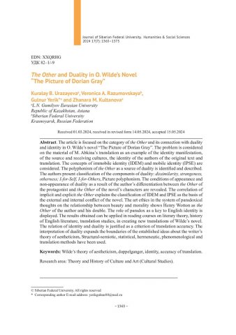 Библиографическое описание:The Other and Duality in O. Wilde`s Novel "The Picture of Dorian Gray" = Другой и двойственность в романе О. Уайльда "Портрет Дориана Грея" / K. B. Urazayeva, V. A. Razumovskaya, Gulnur Yerik, Z. M. Kultanova. - Текст : непосредственный // Журнал Сибирского федерального университета. Гуманитарные науки. - 2024. - Т. 17, № 7. - С. 1363-1375. - Библиогр.: с. 1374-1375. - ISSN 1997-1370.