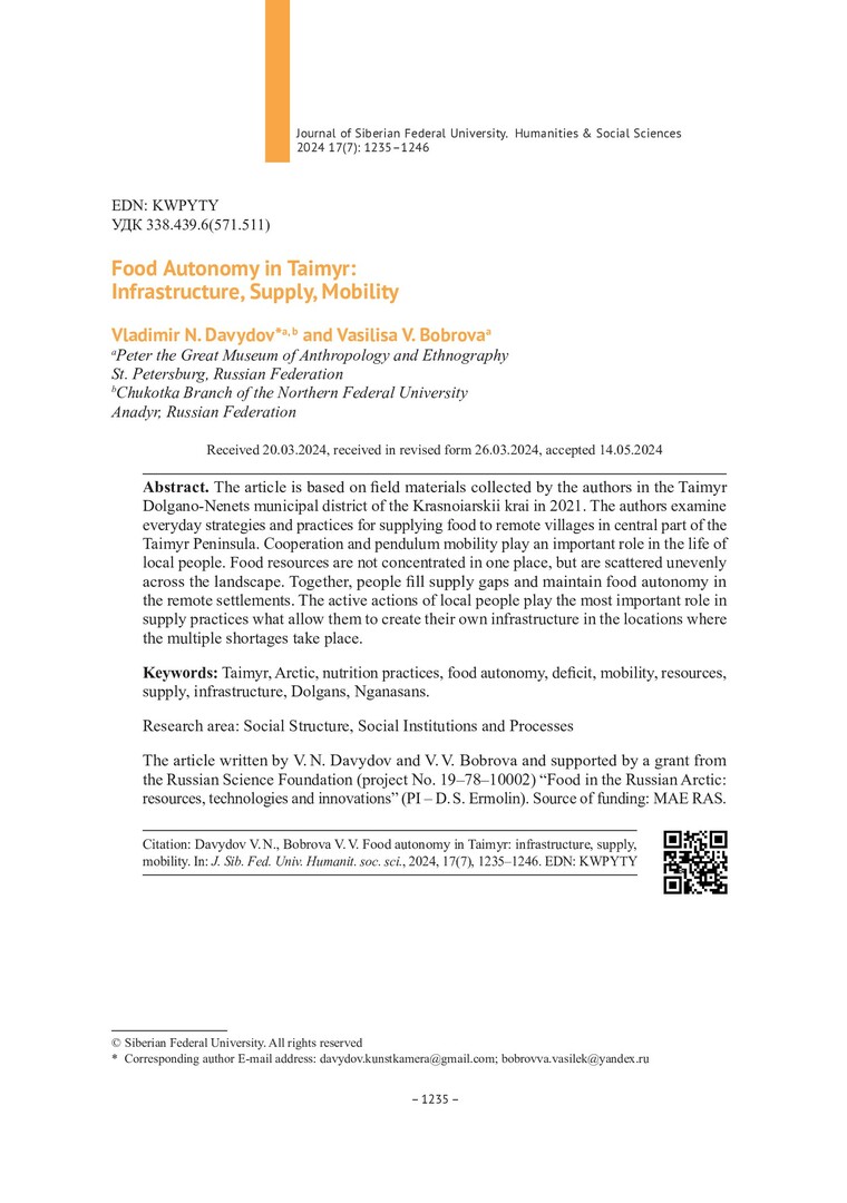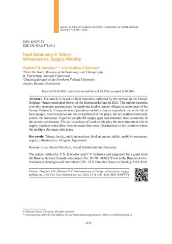 Библиографическое описание:Давыдов, В. Н. Продовольственная автономность на Таймыре: инфраструктура, снабжение, мобильность = Food Autonomy in Taimyr: Infrastructure, Supply, Mobility / В. Н. Давыдов, В. В. Боброва. - Текст : непосредственный // Журнал Сибирского федерального университета. Гуманитарные науки. - 2024. - Т. 17, № 7. - С. 1235-1246. - Библиогр.: с. 1245-1246. - ISSN 1997-1370.