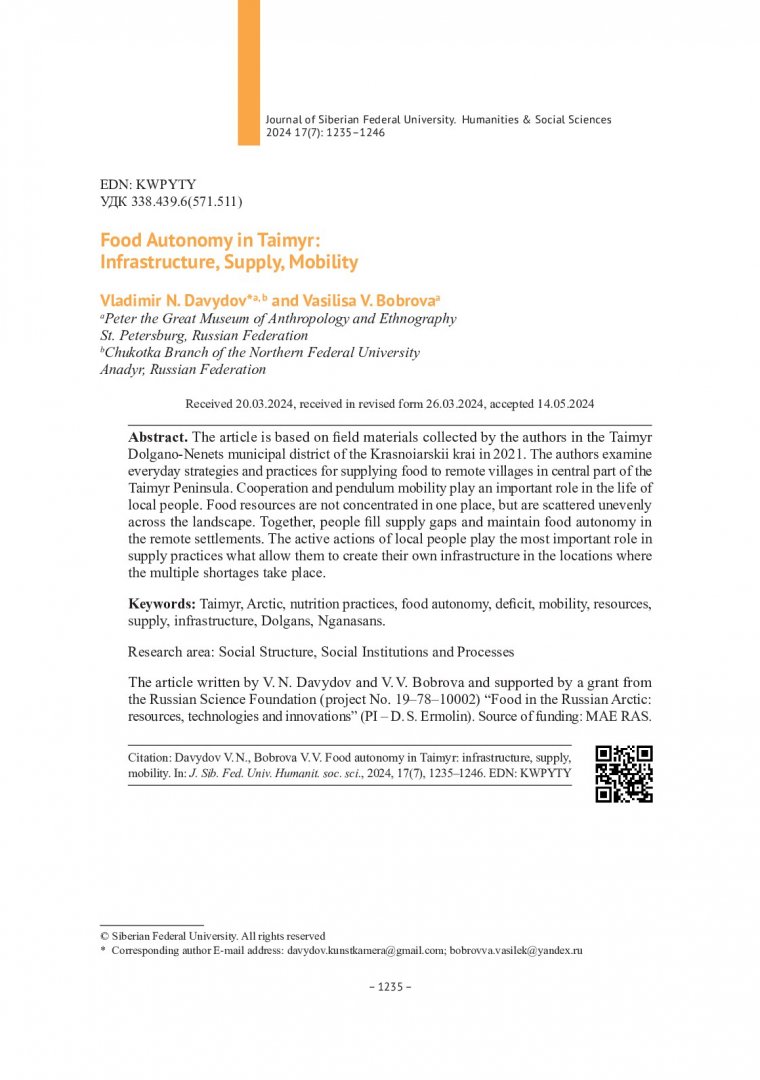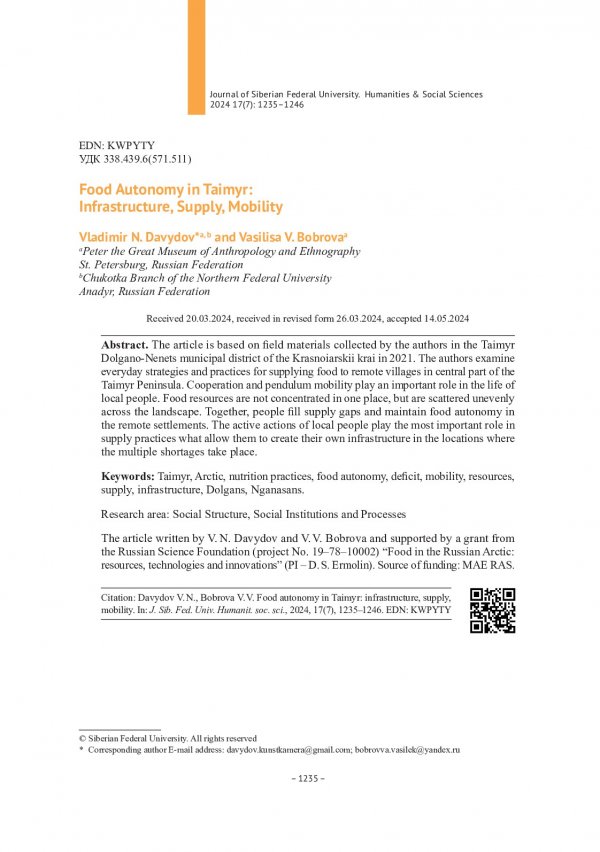 Аннотация:Статья базируется на полевых материалах, собранных авторами в Таймырском Долгано-Ненецком муниципальном районе Красноярского края в 2021 г. В тексте рассматриваются повседневные стратегии и практики снабжения пищевыми продуктами удаленных сел центрального Таймыра.