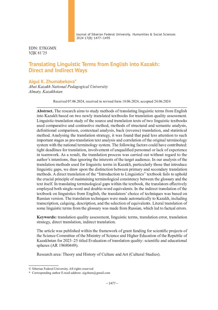 Библиографическое описание:Zhumabekova, Aigul. Translating Linguistic Terms from English into Kazakh: Direct and Indirect Ways = Перевод терминов лингвистики с английского на казахский язык: прямой и опосредованный / A. K. Zhumabekova. - Текст : непосредственный // Журнал Сибирского федерального университета. Гуманитарные науки. - 2024. - Т. 17, № 8. - С. 1477-1493. - Библиогр.: с. 1491-1493. - ISSN 1997-1370.
