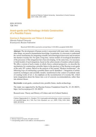 Библиографическое описание:Дегтяренко, К. А. Авангард и техника: художественное конструирование возможного будущего = Avant-garde and Technology: Artistic Construction of a Possible Future / К. А. Дегтяренко, Т. К. Ермаков. - Текст : непосредственный // Журнал Сибирского федерального университета. Гуманитарные науки. - 2024. - Т. 17, № 8. - С. 1454-1464. - Библиогр.: с. 1462-1464. - ISSN 1997-1370.