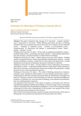 Библиографическое описание:Efimov, Valery. University 4.0: What Type of Thinking is Coming? = Университет 4.0: какое мышление будет культивироваться в будущем?. Pt. I / V. S. Efimov, A. V. Lapteva. - Текст : непосредственный // Журнал Сибирского федерального университета. Гуманитарные науки. - 2024. - Т. 17, № 8. - С. 1465-1476. - Библиогр.: с. 1474-1476. - ISSN 1997-1370.