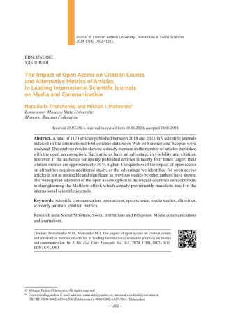 Библиографическое описание:Трищенко, Н. Д. Влияние открытого доступа на показатели цитируемости и альтернативных метрик статей в ведущих международных научных журналах по медиа и коммуникации = The Impact of Open Access on Citation Counts and Alternative Metrics of Articles in Leading International Scientific Journals on Media and Communication / Н. Д. Трищенко, М. И. Макеенко. - Текст : непосредственный // Журнал Сибирского федерального университета. Гуманитарные науки. - 2024. - Т. 17, № 8. - С. 1602-1611. - Библиогр.: с. 1610-1611. - ISSN 1997-1370.