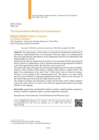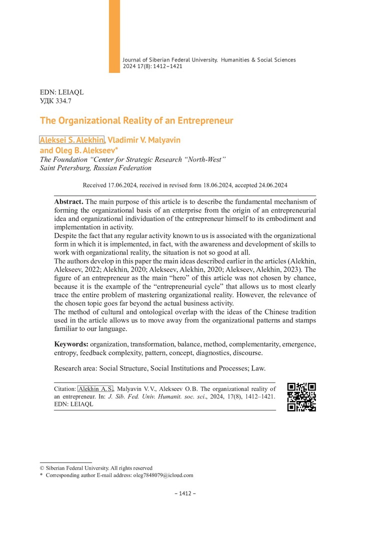 Библиографическое описание:Алехин, А. С. Организационная реальность предпринимателя = The Organizational Reality of an Entrepreneur / А. С. Алехин, В. В. Малявин, О. Б. Алексеев. - Текст : непосредственный // Журнал Сибирского федерального университета. Гуманитарные науки. - 2024. - Т. 17, № 8. - С. 1412-1421. - Библиогр.: с. 1420-1421. - ISSN 1997-1370.