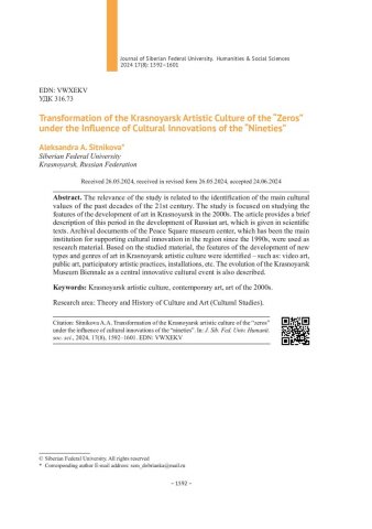 Аннотация:Исследование сфокусировано на изучении особенностей развития искусства в Красноярске в 2000-е гг. В статье приведена краткая характеристика данного периода в развитии российского искусства, которая дается в научных текстах.