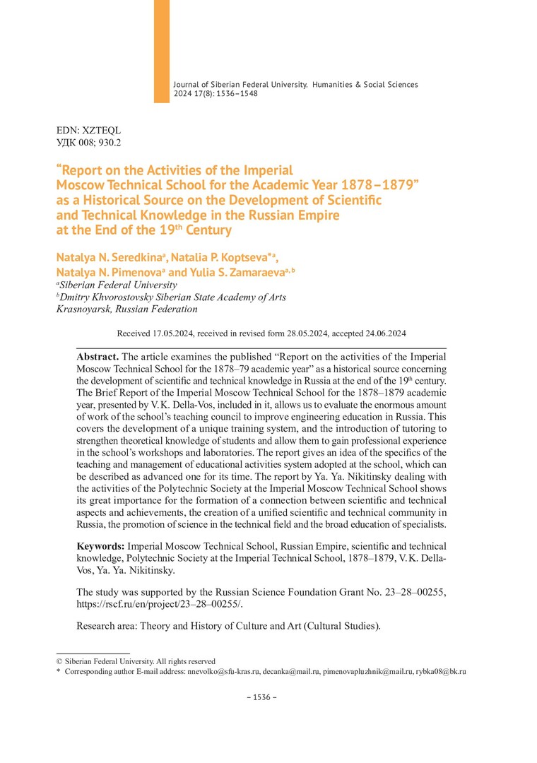 Библиографическое описание:"Отчет о деятельности Императорского Московского технического училища за 1878–1879 академический год" как исторический источник о развитии научно-технического знания в Российской империи в конце XIX века = "Report on the Activities of the Imperial Moscow Technical School for the Academic Year 1878–1879" as a Historical Source on the Development of Scientific and Technical Knowledge in the Russian Empire at the End of the 19th Century / Н. Н. Середкина, Н. П. Копцева, Н. Н. Пименова, Ю. С. Замараева. - Текст : непосредственный // Журнал Сибирского федерального университета. Гуманитарные науки. - 2024. - Т. 17, № 8. - С. 1536-1548. - Библиогр.: с. 1544-1548. - ISSN 1997-1370.