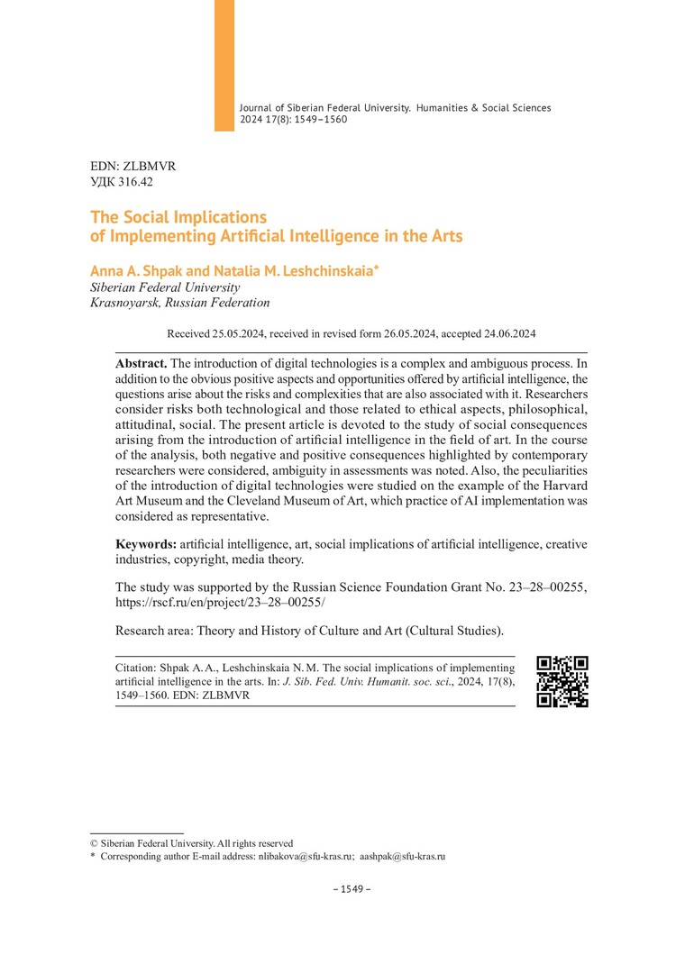 Библиографическое описание:Шпак, А. А. Социальные последствия внедрения искусственного интеллекта в области искусства = The Social Implications of Implementing Artificial Intelligence in the Arts / А. А. Шпак, Н. М. Лещинская. - Текст : непосредственный // Журнал Сибирского федерального университета. Гуманитарные науки. - 2024. - Т. 17, № 8. - С. 1549-1560. - Библиогр.: с. 1556-1560. - ISSN 1997-1370.