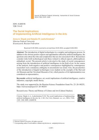 Аннотация:Настоящая статья посвящена изучению социальных последствий, возникающих ввиду внедрения искусственного интеллекта в области искусства.